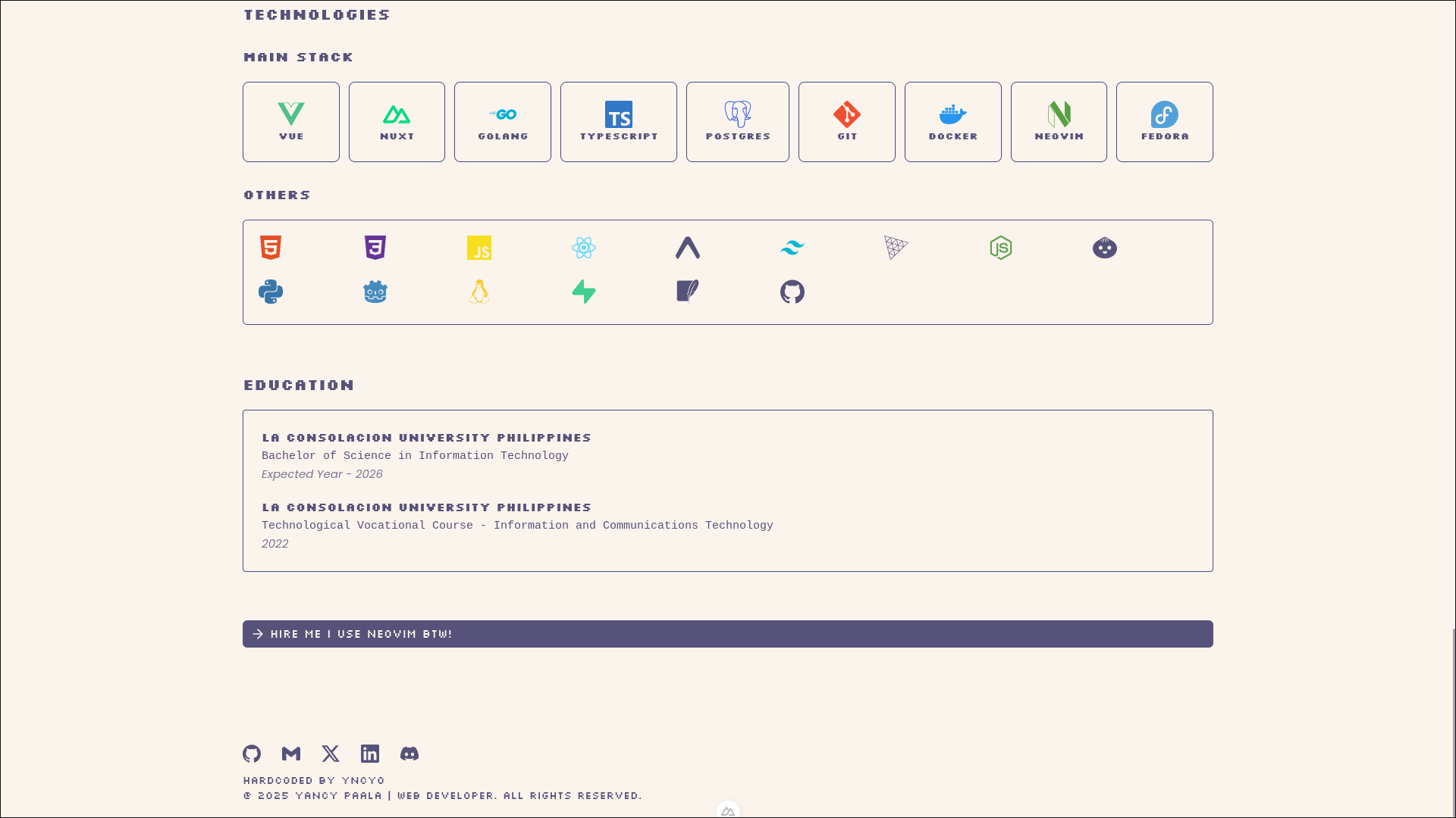 Hello there! My name is Yancy. A web developer that focuses on building and collaboration among front-end projects specially Vue/Nuxt, And back-end projects using Golang.